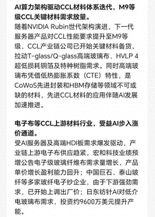 预计以电子布为代表的PCB部分上游材料,2026年将持续受AI需求的高速增长,持续出现涨价趋势。