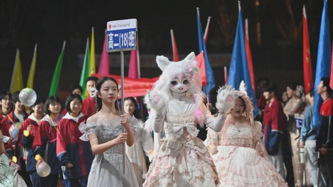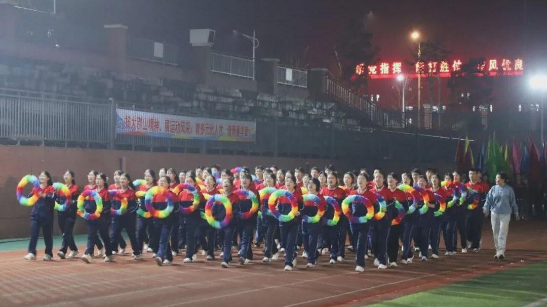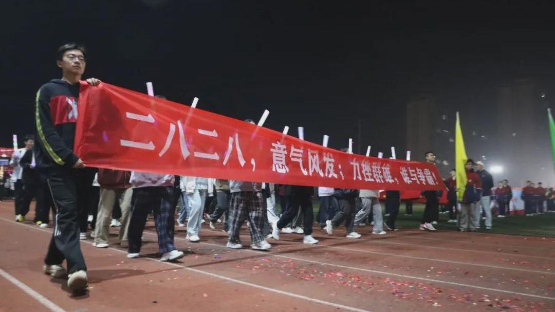 紧随各方阵之后,全校高一、高二、高三三个年级的所有班级依次登场,成为开幕式上一道鲜活的青春风景线。各班学子身着整齐服装,迈着坚定步伐,各显其才展特色:有的班级高举手绘的运动主题标语牌,字里行间满是拼搏宣言;有的班级手持自制的彩色气球、纸花等创意道具,在灯光下格外亮眼;还有的班级齐声喊出专属励志口号,声音洪亮震彻赛场,充分展现出不同班级的独特气质与团结风貌,引得现场掌声、欢呼声此起彼伏。
