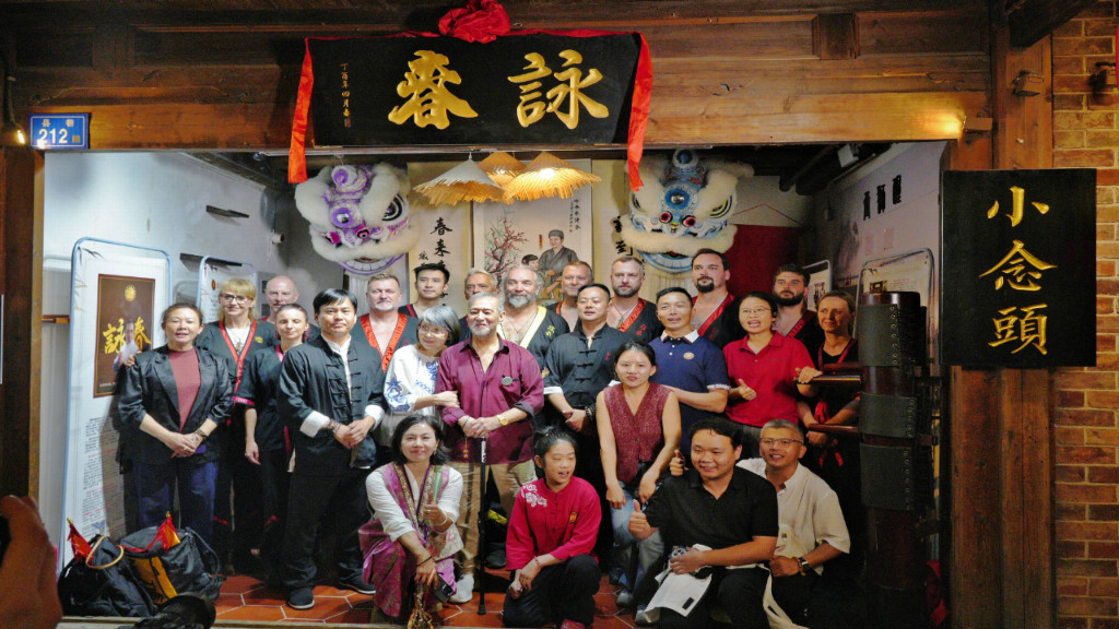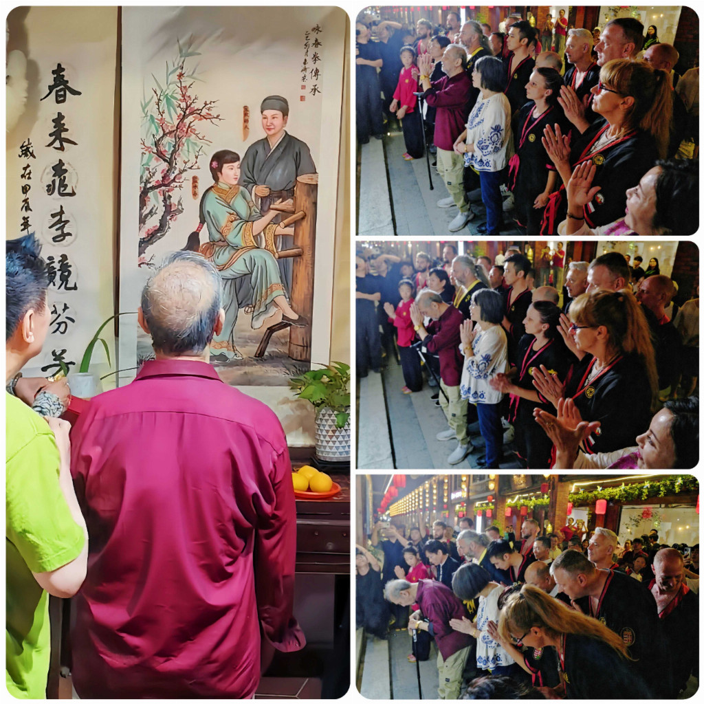 作为本次盛会的核心环节,“寻根祭祖”与“宗师立碑”活动拉开了文化溯源的序幕。全球咏春弟子循着历史脉络,走进闽中天地会红花亭(保民殿)与莆田古街咏春非遗展示馆,拜谒咏春拳创始人五枚师太(俗名朱红梅:明朝皇室后裔、少林五老之一、严咏春师尊、南少林神尼)的纪念碑和传承图。不同信仰、肤色、语言的咏春传人,皆以双合掌、三鞠躬致敬先祖,完成跨越国界的文化寻根(多图组合置正文后,附带解读)。