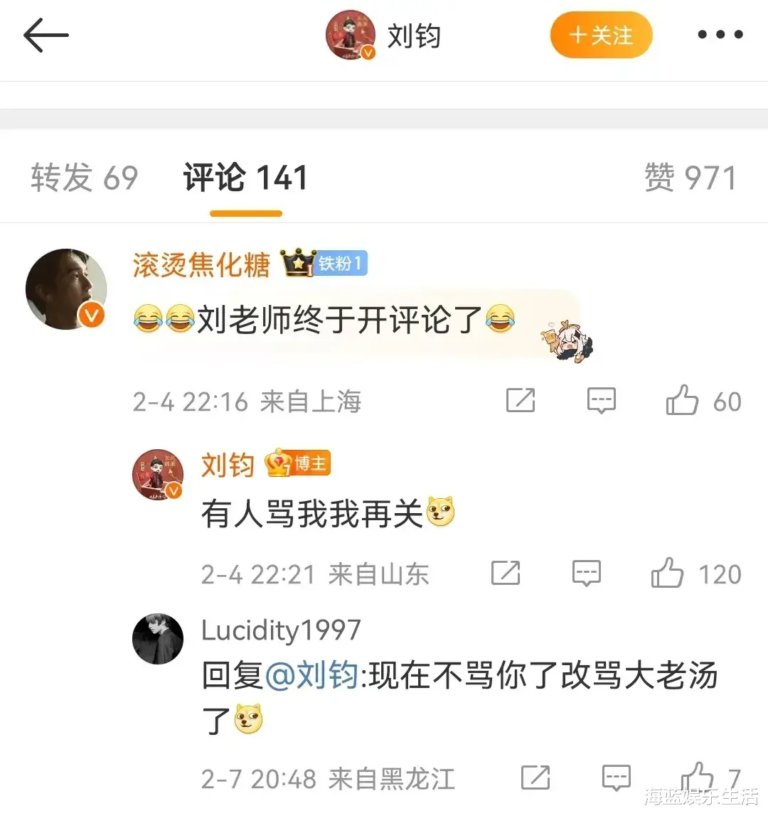 刘钧回复说:有人骂我我再关(手动狗头)。