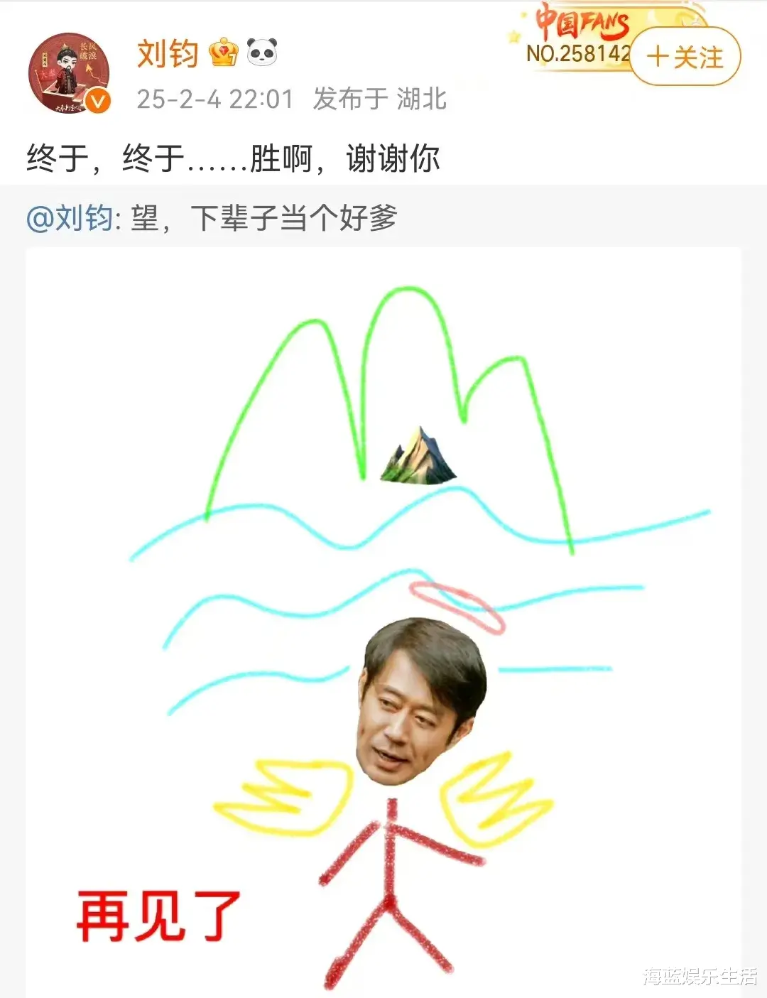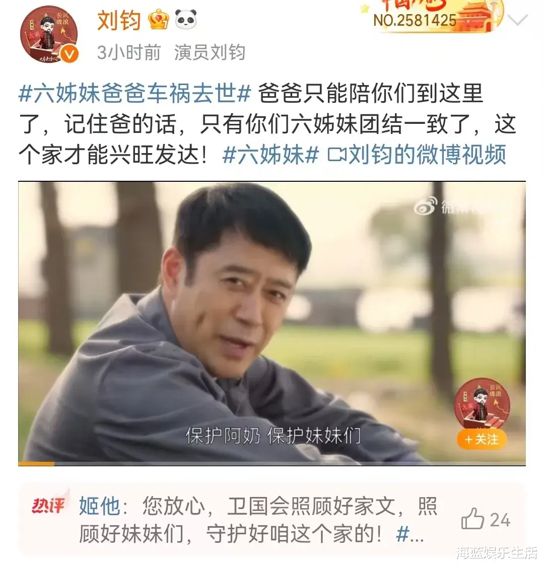 如今,刘钧终于演了次好爹。所以,《六姊妹》开播后,刘钧再次发文说:终于,终于……胜啊,谢谢你。