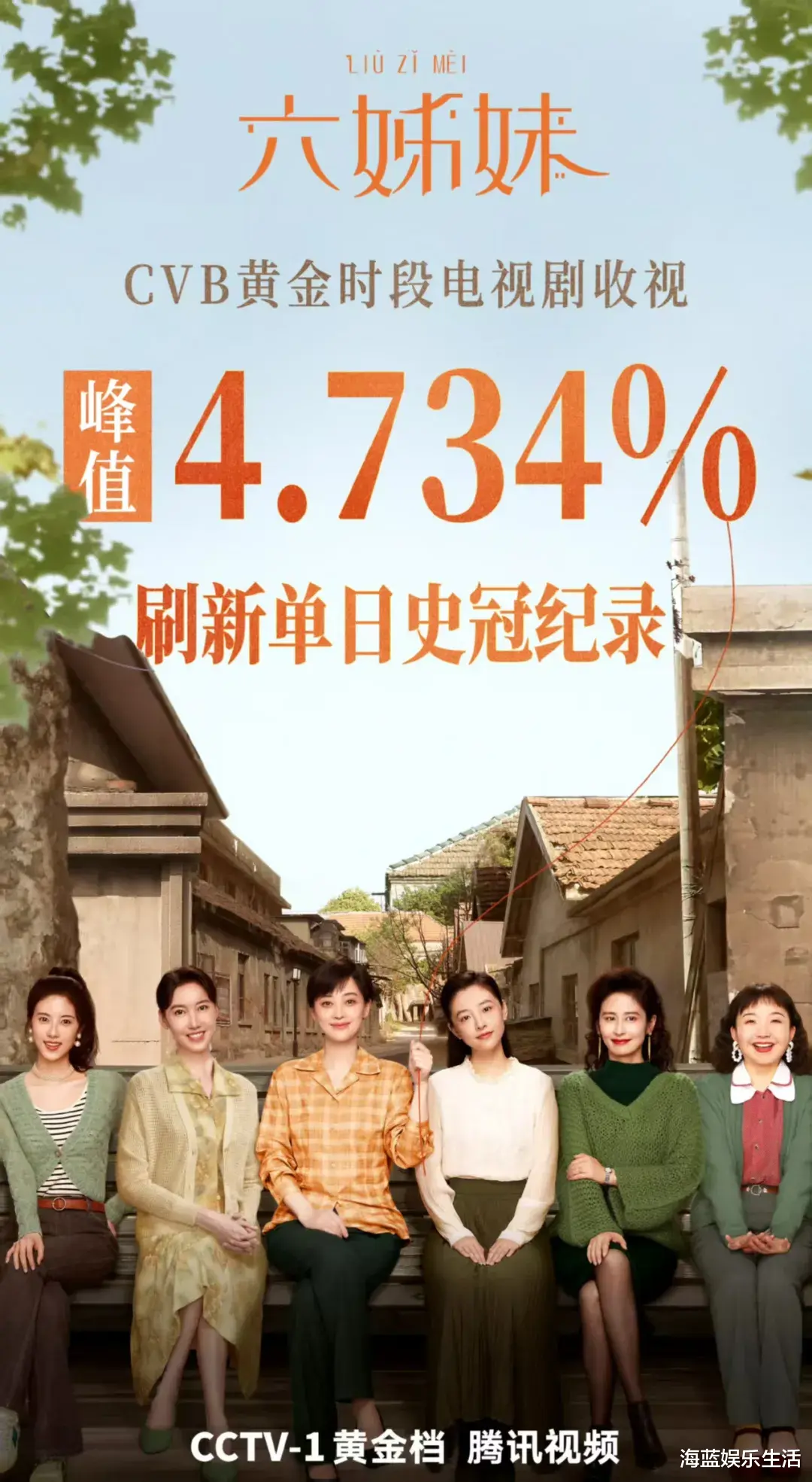 年代剧《六姊妹》自开播以来,收视一直很高,收视峰值破4.7,刷新CVB(中国视听大数据)黄金时段电视剧收视单日史冠纪录,刷新酷云近3年实时收视破4最快纪录,成为腾讯视频站内热度最快破27000的年代剧。