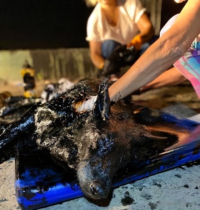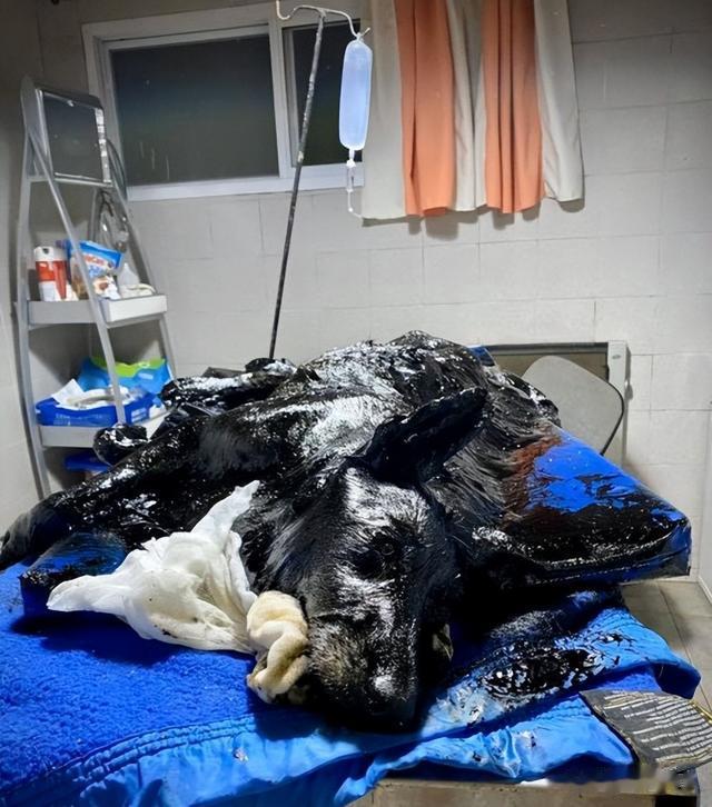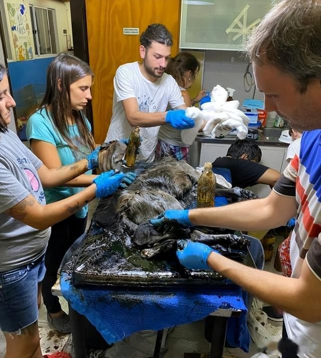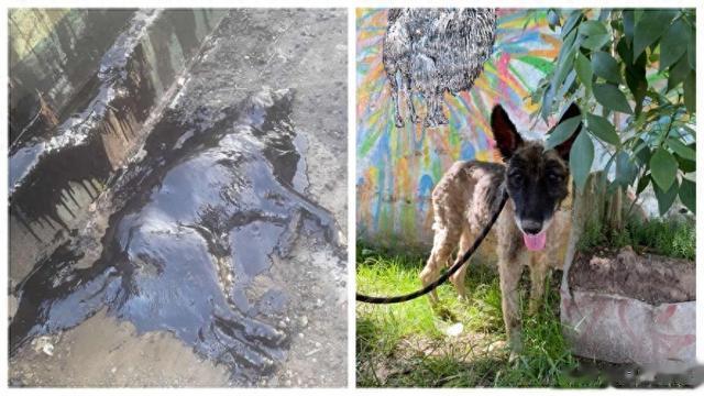 闻讯赶来的动物保护组织义工们发现,这只狗狗全身都沾满了沥青,而且非常均匀,不像是自己掉进沥青坑里的,反而更像是人为涂抹上去的。