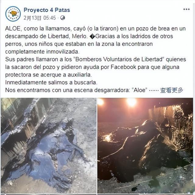故事发生在阿根廷一个小镇——Libertad镇,2020年的一个星期四(2月13日),有人发现一只全身被沥青覆盖的狗狗,已奄奄一息,急切需要救援。于是,有人就致电给当地的动物保护组织——Proyecto 4 Pata求助。
