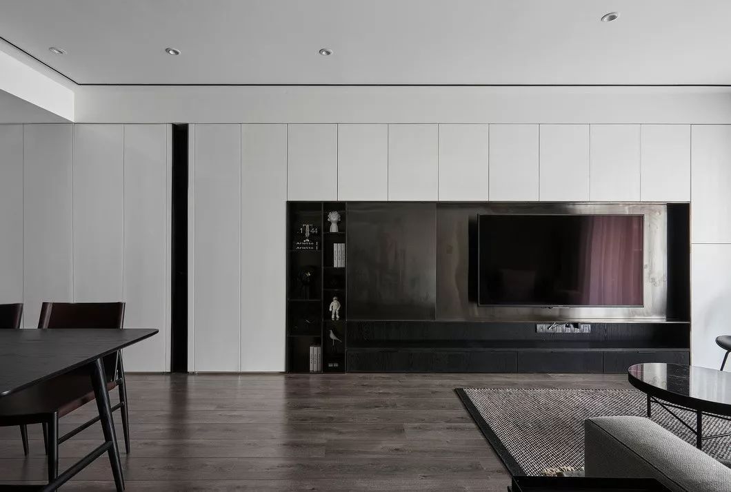 3、客厅收纳一定要做全,条件允许可以做整墙电视柜,或者添置别的收纳柜,不然你住久了真的会后悔。还有,开放格不要超过柜体面积的20%,打扫起来够你累的。