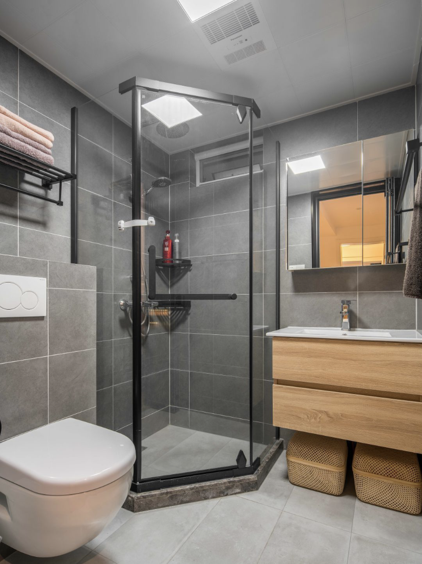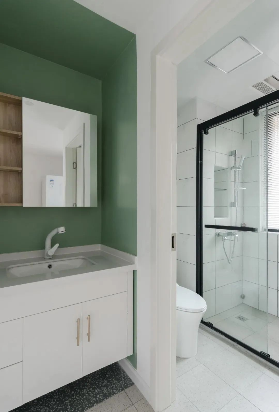 1、如果想清洁更轻松,洗手盆选择台下盆,安装壁挂式马桶和悬挂式浴室柜,浴缸装嵌入式的,干湿分离不要做玻璃隔断,可以用隐形浴帘。