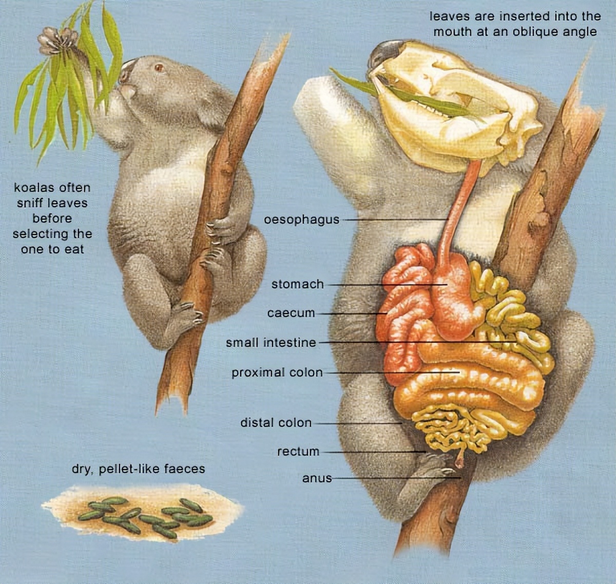 植食性的有袋类和普通植食性哺乳动物不同,它们食物发酵的地方是后肠,由于考拉需要处理难以被提取能量的桉树叶,所以它们的后肠与身体的比例是哺乳动物中最大的。