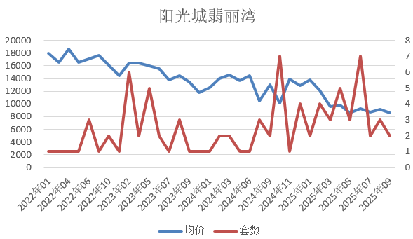 阳光城翡丽湾:位于南屿的大盘,主打高新区万达+地铁预期,项目价格杂在2023年6月开始下跌,此前均价在1.7W左右,一路跌到了2025年2月的9.5K,近半年稳定在9K左右。