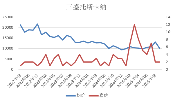 三盛托斯卡纳:同样位于南屿的大盘,主打的也是高新区万达,2023年9月项目开始下跌,此前均价在1.7W左右,下跌到2024年9月的1W均价,近一年稳定在1W左右。