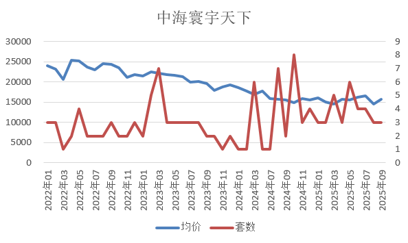 中海寰宇天下:板块的代表天花板,2023年9月前,项目成交均价都在2W以上,高峰期集中在2.4W左右,随后开始下跌,持续跌到2024年7月的1.6W。