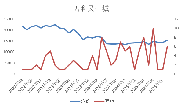 万科又一城:板块的二哥,价格一直比不过中海,项目在2023年9月开始下跌,此前均价2.2W左右,随后下跌到2024年7月的1.4W左右。