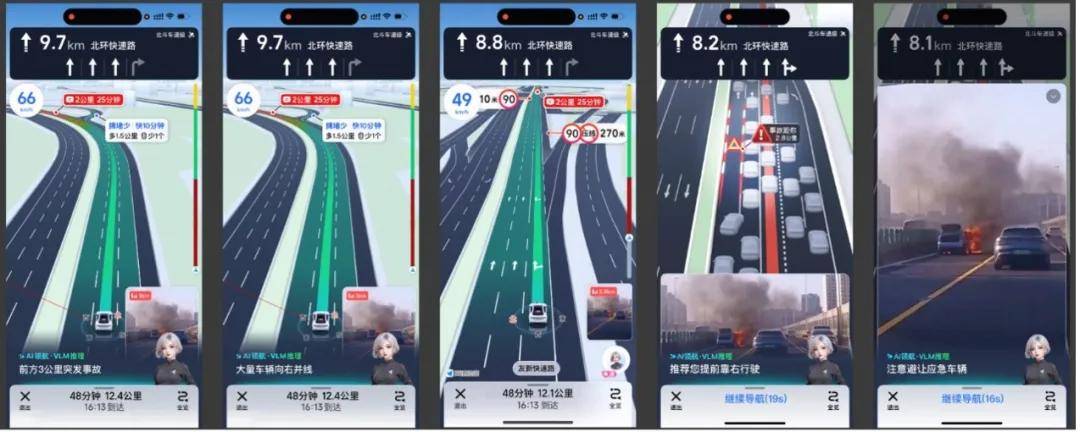 这种「超视距」能力通过 TrafficVLM 模型来实现,就像给系统装上了一双「鹰眼」。当几公里外的道路突发事故时,TrafficVLM 会通过实时孪生交通系统第一时间感知异常,快速识别出事故位置,并预判接下来的发展:拥堵可能迅速蔓延,形成长达 3 公里的堵车路段。基于这个能力,高德能在车辆抵达拥堵区域之前就推送预警:「前方三公里突发事故,大量车辆正在向右并线,建议您提前靠右行驶,注意避让应急车辆。」