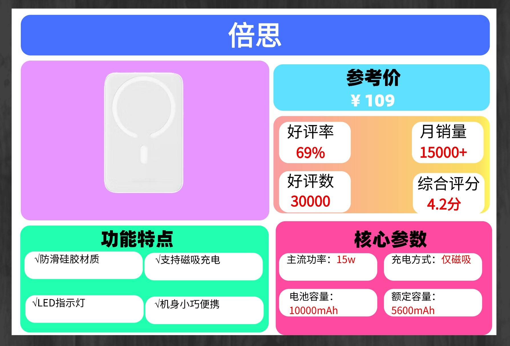在容量方面,拥有10000mAh大小,搭载顶级126280锂聚合物电芯,采用与新能源汽车同款的高能量密度车芯,续航能力强劲,满电状态下轻松为两台设备充满电,剩余一格电量还能继续充耳机、风扇等;充电方式上更加的便捷,强劲的吸附能力,搭载了18颗N52磁芯以及3500GS磁芯,能够牢牢的吸附住苹果手机,狂甩都不会走位;自带了双接口数据线,type-C、Lightning,这一充电方式能够给市面上99%设备进行充电;支持PD3.0和QC3.0双向快充,在配备上20W的高功率快充,充电速度超级快!综合来看,这款充电宝售价仅百元,却具备媲美千元旗舰的充电效率和安全性能,在众多平价充电宝中性价比极为突出!