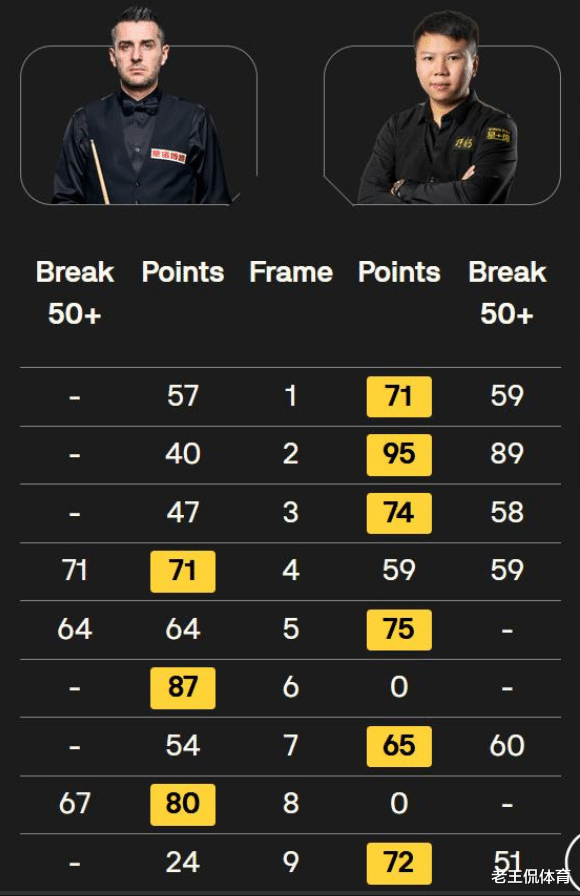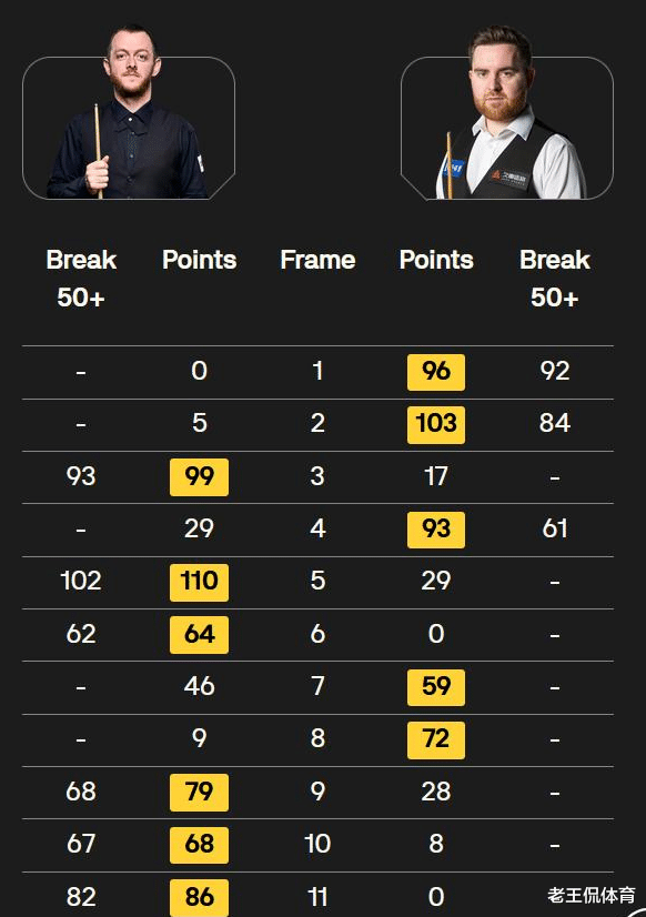 比赛过程中,琼斯曾一度5-3领先拿到赛点,但艾伦展现出了“逆转之王”的本色,连续挽救两个赛点,最终在决胜局单杆82分完成绝杀,以6-5的比分惊险晋级。
