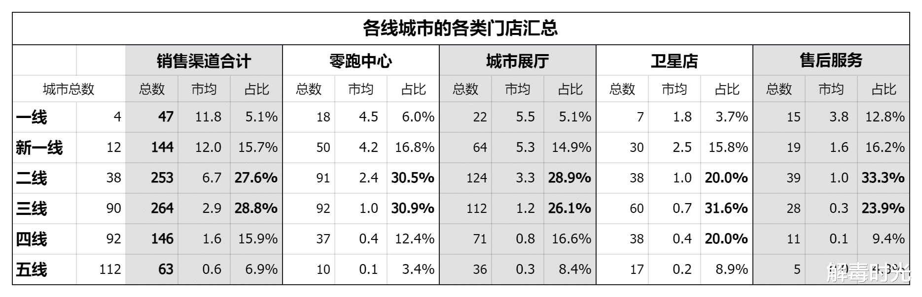 从城市的线级来看,零跑的渠道布局非常下沉。越是低线级城市,每百万城镇人口能够分得的门店数越多。在五线城市,每百万城镇人口,可以对应1.38个门店;而在一线城市,每百万城镇人口只能对应分得0.64个门店。这和零跑本身的产品价格定位非常匹配,越是低收入的下沉城市越能获得零跑的重视(以上数据中,人口数据参考国家统计数据)。