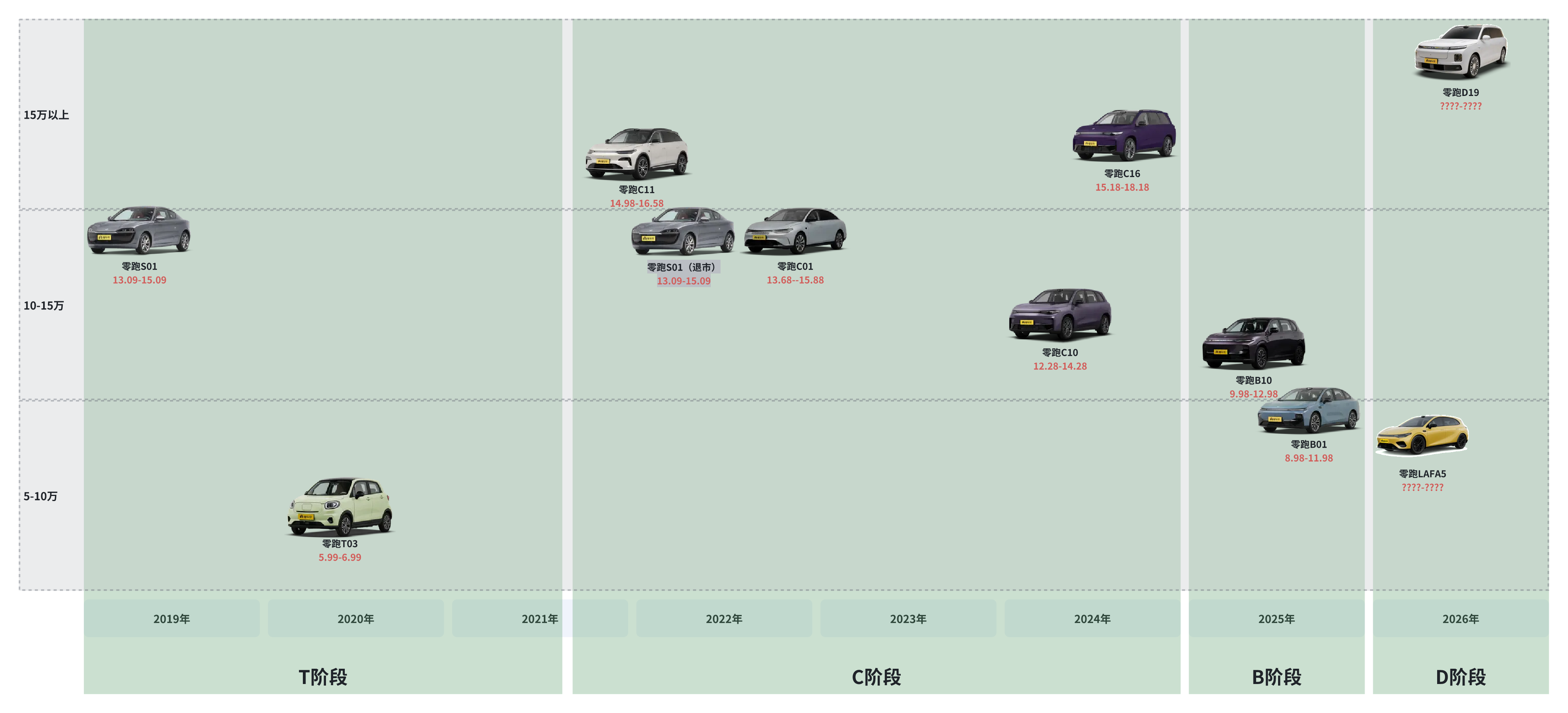 为什么零跑需要借助D19和Lafa5提高品牌?从公开的财务数据对比每年的销售额和销量,我们可以算出零跑的大概的平均售价。2021年的T阶段以T03为核心,平均售价为6.99万。2022和2023年的C阶段平均售价拉到了11万以上,但随着竞争恶化,C阶段的末尾,平均售价已经下降到了不到11万,并且在2025年上半年持续下降,相信随着B系列的加入,会继续拉低零跑的平均售价。