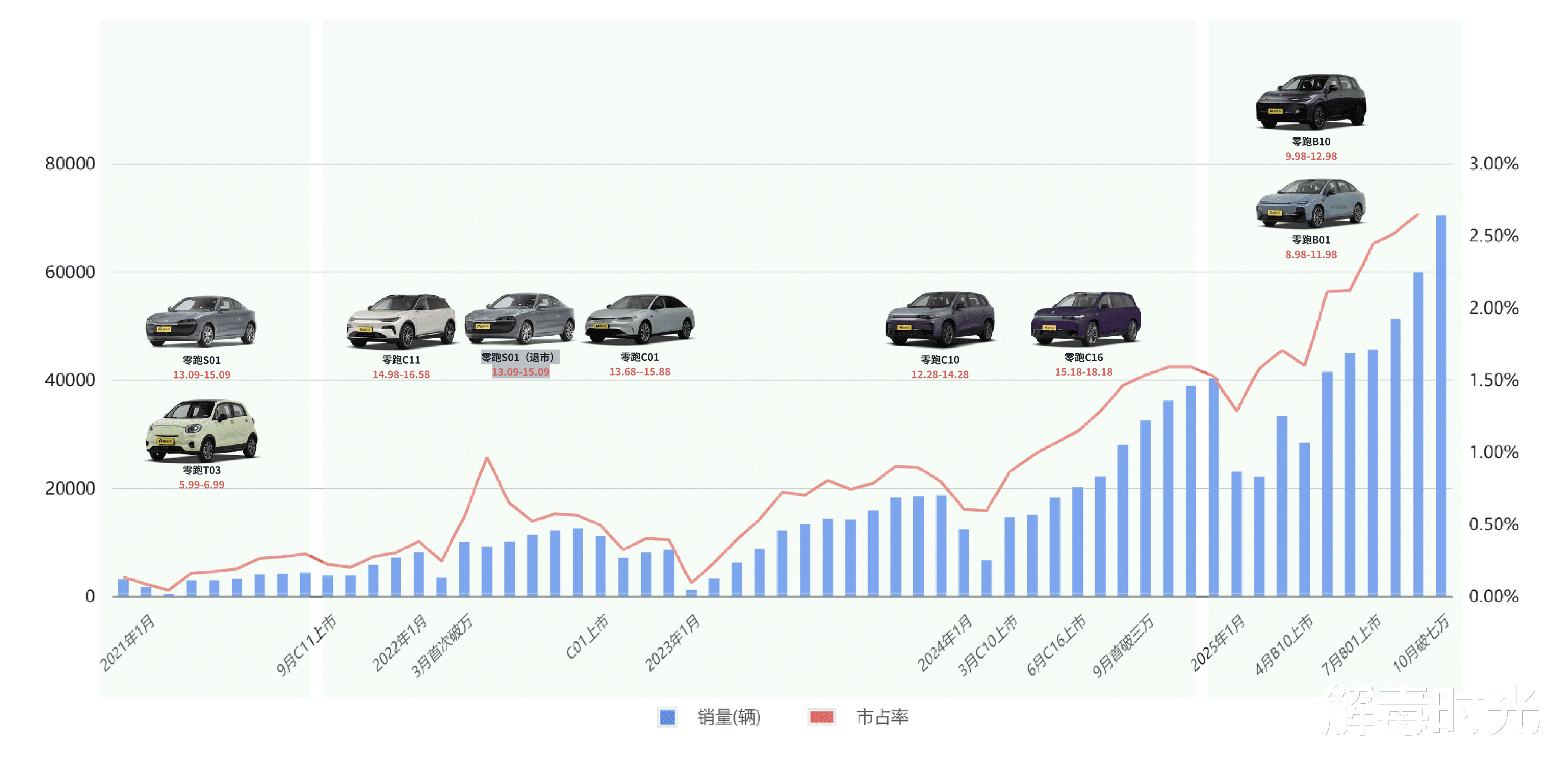 进入2024年,零跑先后发布了C10和C16,并一举在9月份突破了三万台销量大关,并一路向上,在2024年12月收官于40173台。很显然这个时候的零跑,已经走入了一个正循环的上升通道,进入2025年更是势不可挡,伴随着B10和B01的上市,突破月销5万台大关,最终站在10月的7万巅峰。紧接着,零跑还有Lafa5和D19两款产品已经在发布节奏中,品牌的势能会持续增强。