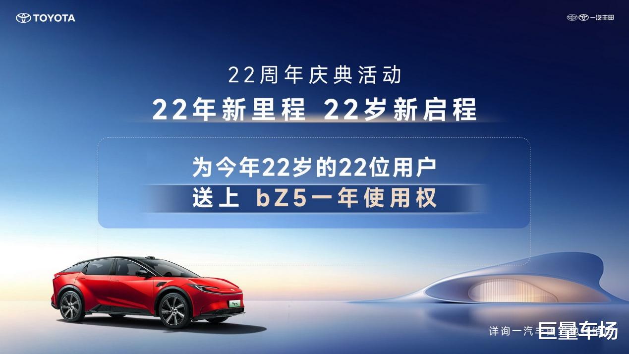 此外,一汽丰田还特别针对22岁的年轻人推出了特别政策。9月26日-10月26日期间,年龄22岁,有驾照、对bZ5感兴趣、认可一汽丰田品牌,并愿意分享精彩生活的年轻人,可就近到一汽丰田经销店报名注册,就有机会免费获得bZ5一年使用权,还有机会参与厂家组织的活动,展示了一汽丰田期待与年轻用户同行,共创美好生活的愿景。