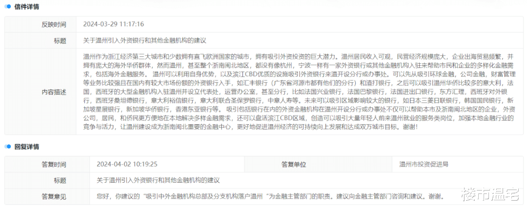去年,曾有市民在民呼我为平台上向有关部门建议,引进外资银行和其他金融机构,但有关部门并未给予明确答复。