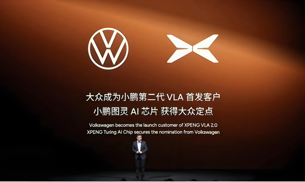 04 小鹏的技术赋能大众与小鹏的合作早已超越简单的技术供应。在11月5日的小鹏汽车科技日上,董事长何小鹏宣布了两项具有里程碑意义的合作进展:大众汽车成为小鹏第二代VLA大模型的首发客户,同时小鹏自研的图灵AI芯片也获得大众汽车定点。