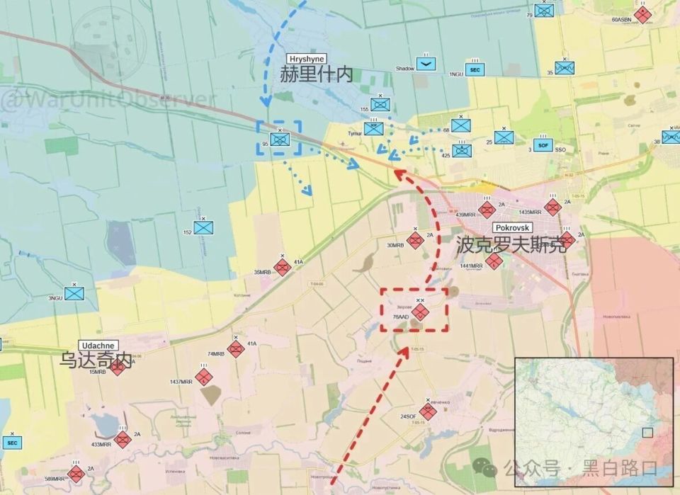 乌军在波克罗夫斯克北部占据铁路线一侧,俄军第76空降师等部队采用机械化进攻推进,试图侧翼包抄乌军,但进攻失败,损失惨重。