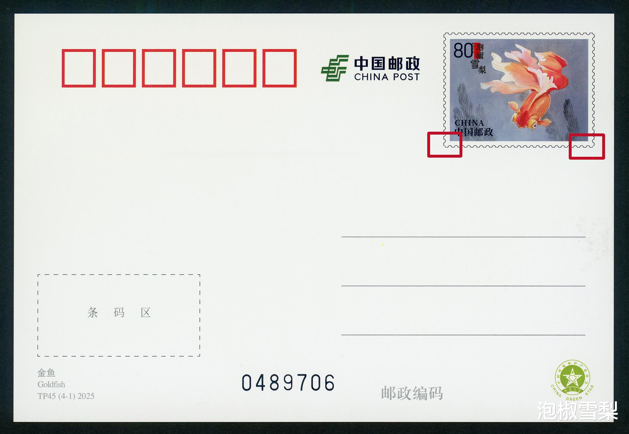 以往邮票多有缩微字母组成的暗记,经过仔细观察,明信片画面部分未发现缩微字母,而每一枚邮资图上均拥有2处缩微暗记,为数字“2025”,分别在邮资图左右下角的齿孔处。