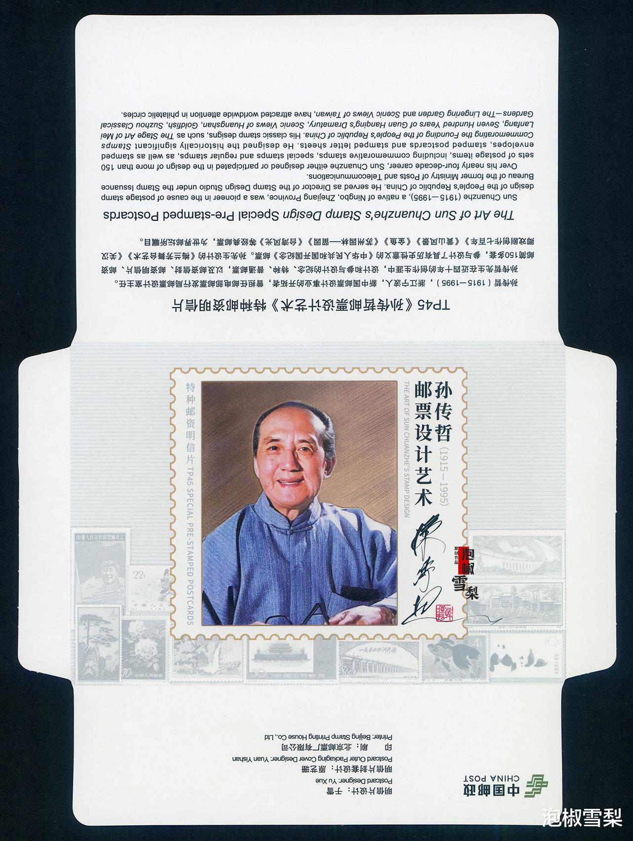 封套为三折叠带翼设计,正面为孙传哲先生照片,右侧为签名和钤印,照片由齿孔图案包围,背景为孙传哲所设计的优秀邮票作品浅色图案。