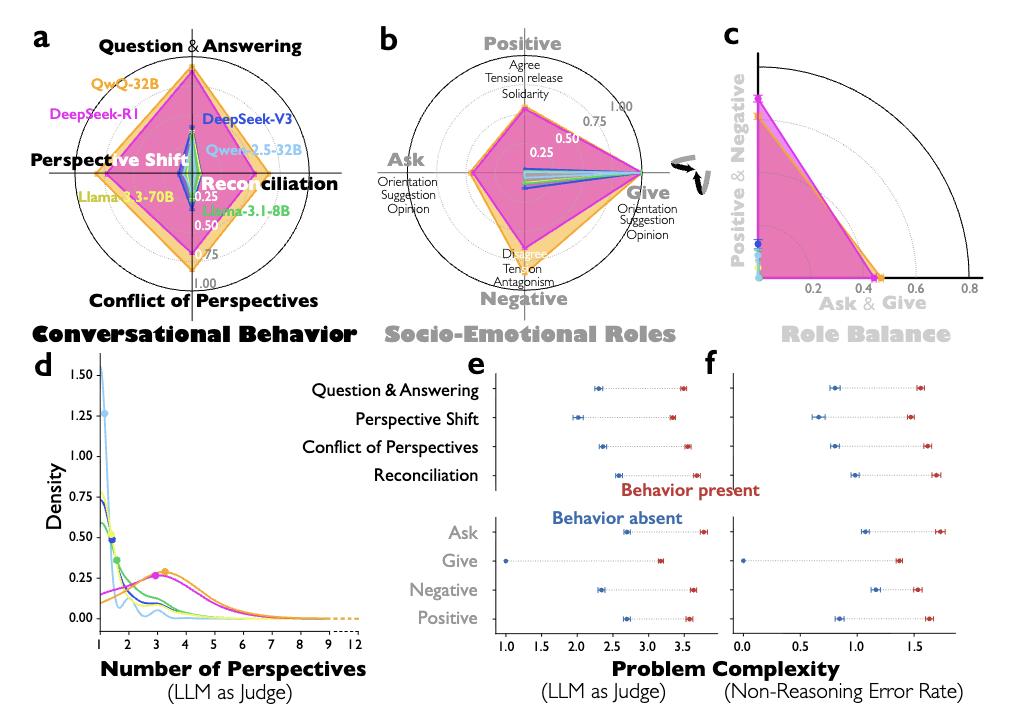 文章的第一个关键论据来自一项此前由同一团队发表的实证研究。他们发现,当前最强的推理模型,如 DeepSeek-R1 和阿里的 QwQ-32B,并不是靠“想得更久”来提升表现的。真正起作用的,是这些模型在推理链(chain of thought)内部自发生成了一种类似“多智能体辩论”的结构,研究者将其命名为“思想社会”(society of thought)。