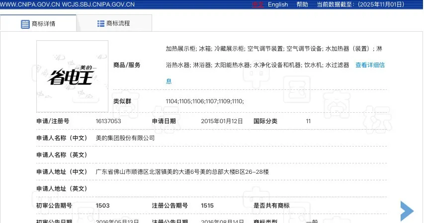十年前,美的集团在空调等电器商品上也成功注册了“美的省电王”商标。