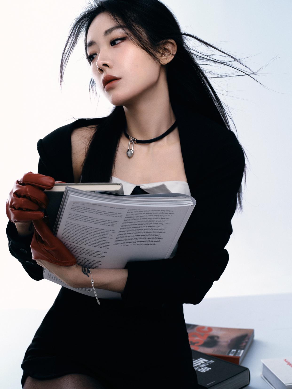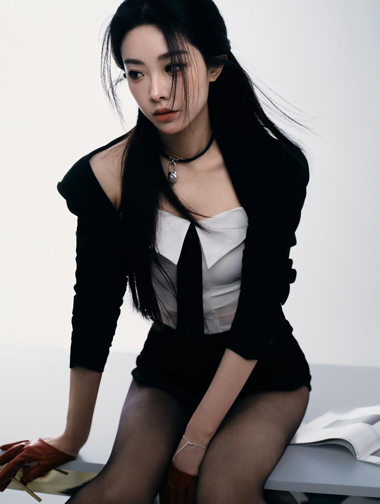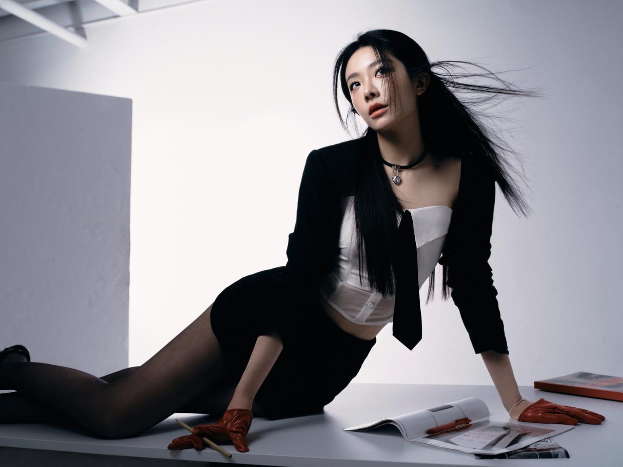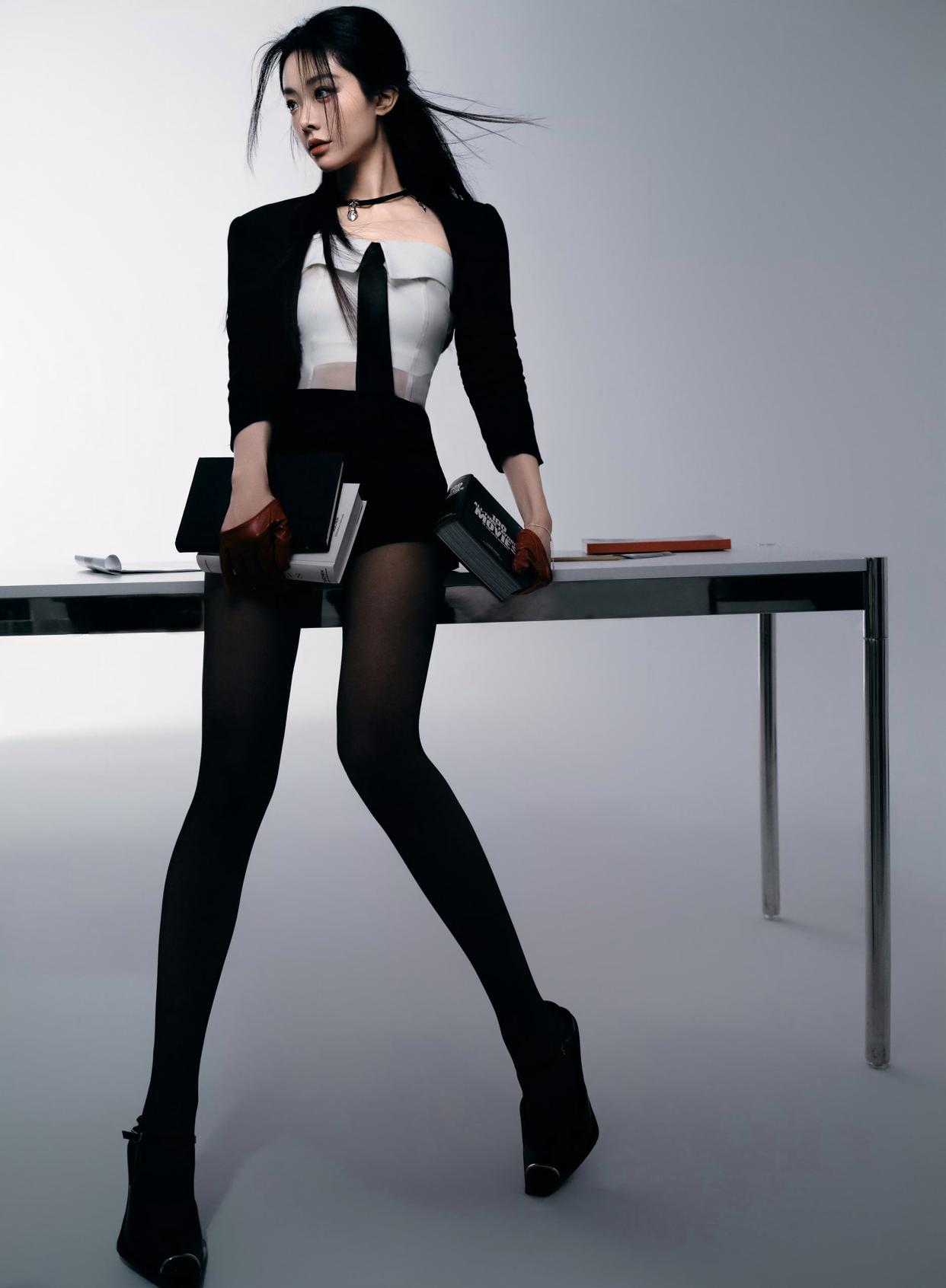 剪裁精良的黑色小西装以锐利的直角肩线勾勒出挺拔的上半身轮廓,与下装的黑色热裤形成绝妙的比例分割。热裤下缘那截雪白的大腿肌肤与黑丝形成惊艳的撞色效果,宛如黑夜中突然绽放的昙花。整体造型将禁欲系的职场元素与暗夜魅惑完美融合,西装硬朗的垫肩与短裤柔美的弧线碰撞出令人屏息的反差美学。