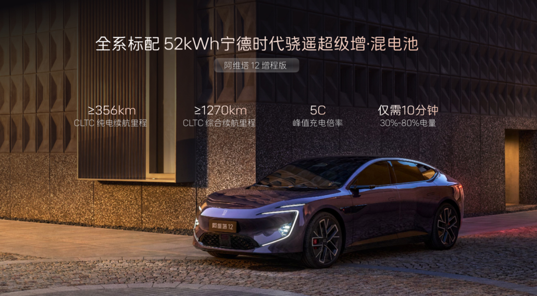 十大升级之中,除了包括激光雷达在内的“含华量”之外,全新阿维塔12最值得说道的就是增程车型,因为新车采用了宁德时代骁遥超级增混电池,电池电量达到52度(比之前增加了13度),CLTC纯电续航里程增加到356公里(比老款增加了111公里),能满足绝大多数人日常通勤代步一周的需要。如果是长途出行,满油满电能提供1270公里的超长续航能力,5C快充更是确保10分钟就能从30%充到80%,选择充电还是加油,完全可以“随遇而安”。