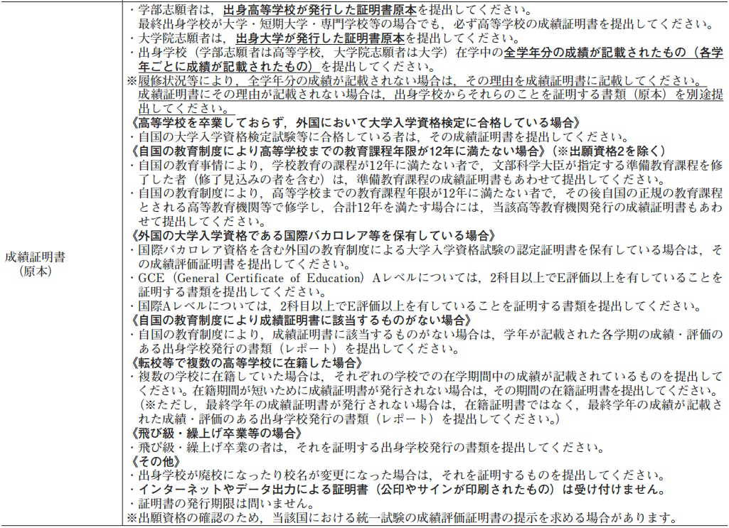 哲学科、体育学科需要提交EJU日语成绩。史学科、国文学科、德国文学科、社会福祉学科、教育学科、心理学科、地理学科、中国语中国文学科、英文学科需要提交EJU日语和综合科目。社会学科需要提交EJU日语、综合科目、数学1。地球科学科需要提交EJU日语、数学1或理科任意一科成绩。数学科、情报科学科、物理学科需要提交EJU日语、数学2。生命科学科需要提交EJU日语、理科任意2科成绩。化学科需要提交EJU日语、理科化学加任意一科成绩。