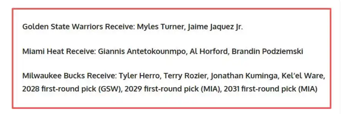 就在这样的背景下,美媒《露天看台》曝出一笔极具分量的三方交易设想,涉及迈阿密热火、金州勇士以及密尔沃基雄鹿。这笔交易的逻辑非常清晰:热火得到真正的争冠核心,勇士解决困扰多年的内线顽疾,雄鹿彻底开启重建模式,如果成行,这笔交易将直接改变联盟格局。