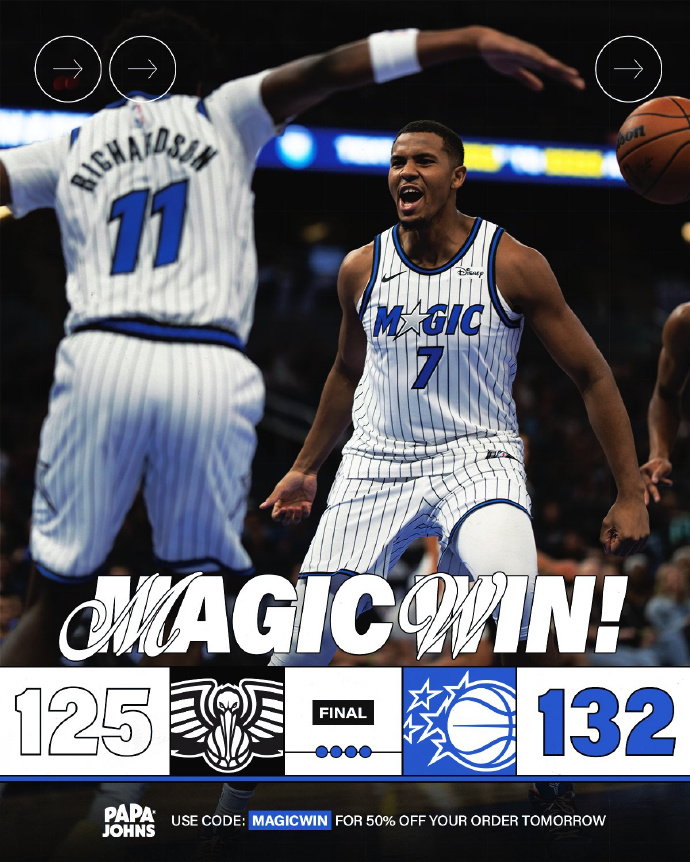 魔术上赛季打出了41胜41负的战绩,胜率刚好达到50%,也通过附加赛打进了季后赛,但是首轮1-4不敌凯尔特人。魔术今年夏天交易得到了贝恩,实力进一步增强,本赛季常规赛有望拿到50胜,大有希望打进次轮,甚至冲击东部决赛。小瓦格纳稳定发挥,出战25分钟,投篮14中8,三分6中3,罚球6中5,砍下全场最高的24分,外加2篮板3助攻2抢断。小瓦格纳上半场打9投5中,三分3中1,罚球4中4,就拿到15分。班凯罗表现也很全面,出战30分钟,11投6中,三分3中2,罚球6中5,砍下19分10篮板3助攻2盖帽。上半场比赛,班凯投篮6中4,三分1中1,罚球6中5,就得到14分7篮板2助攻1盖帽。