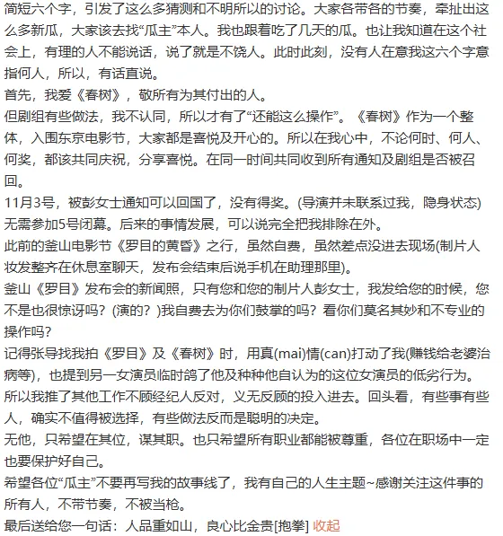 第二部也就是这部引发争议的《春树》,再得知评奖无望以后便被制片人要求回国,并且没邀请她参加闭幕宴。