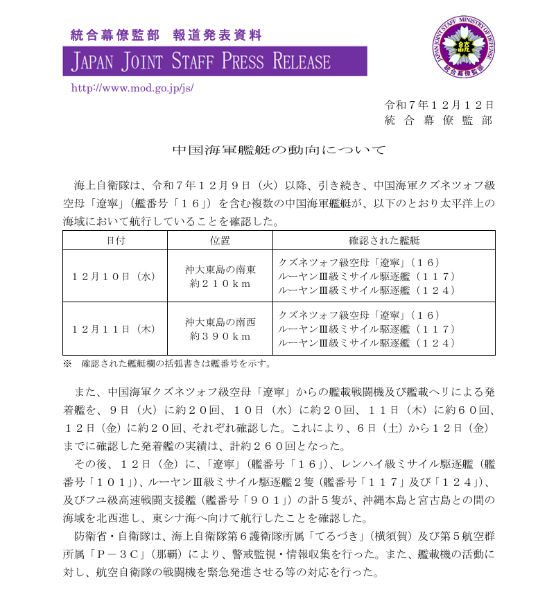 此外,日本海上自卫队还确认了自12月6日至12月12日,辽宁号航空母舰总共进行了约260次的歼-15在内的舰载机的起降作业。