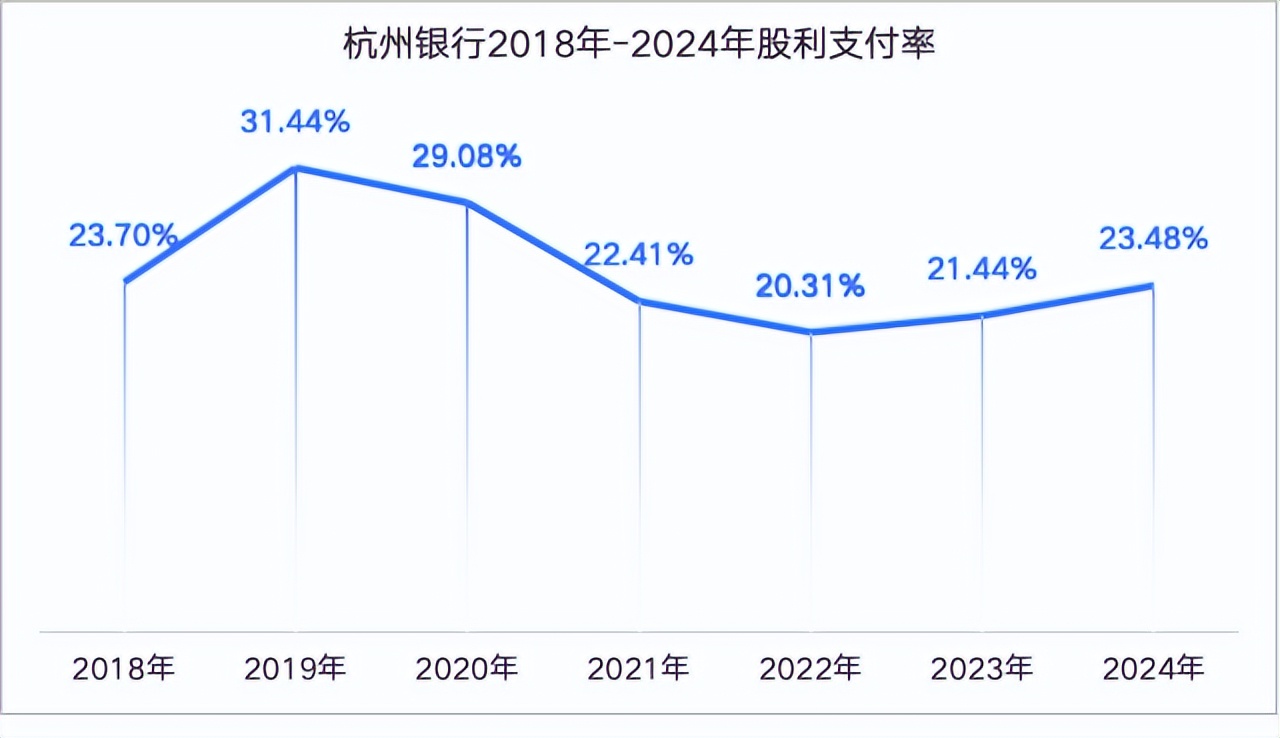与众多上市银行相比,杭州银行分红比例偏低。2024年度,招商银行分红比例达35.32%,在股份制银行中表现突出;兴业银行在2024年首次将分红比例提升至30%以上,中信银行分红比例同样超过30%。国有六大行凭借庞大业务体量,分红规模占据主导地位,分红比例稳定在30%左右,如工商银行2024年分红规模达1097.73亿元,分红比例为30.0%,还推出中期分红。