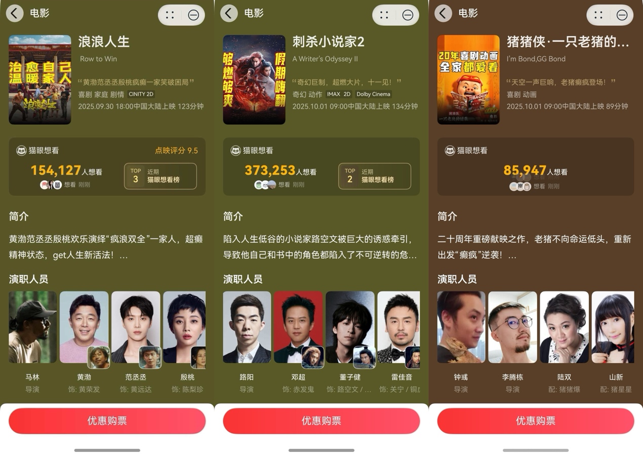 先跟大家聊聊电影吧。国庆档一向竞争激烈,今年有几部新片势头很猛。其中奇幻电影《刺杀小说家2》是我比较看好的,前作口碑就不错,这一部是邓超主演,再加上IMAX特效,基本不会踩坑。另外,《浪浪人生》也是我比较喜欢的,有黄渤主演、韩寒监制,喜剧效果绝对拉满!我还打算带侄子去看《猪猪侠:一只老猪的逆袭》,虽然比较适合孩子看,但我看了一眼梗概,“主角老猪大龄失业被迫送外卖……”,这个故事好像也适合咱牛马们看一看,千万别向命运低头。