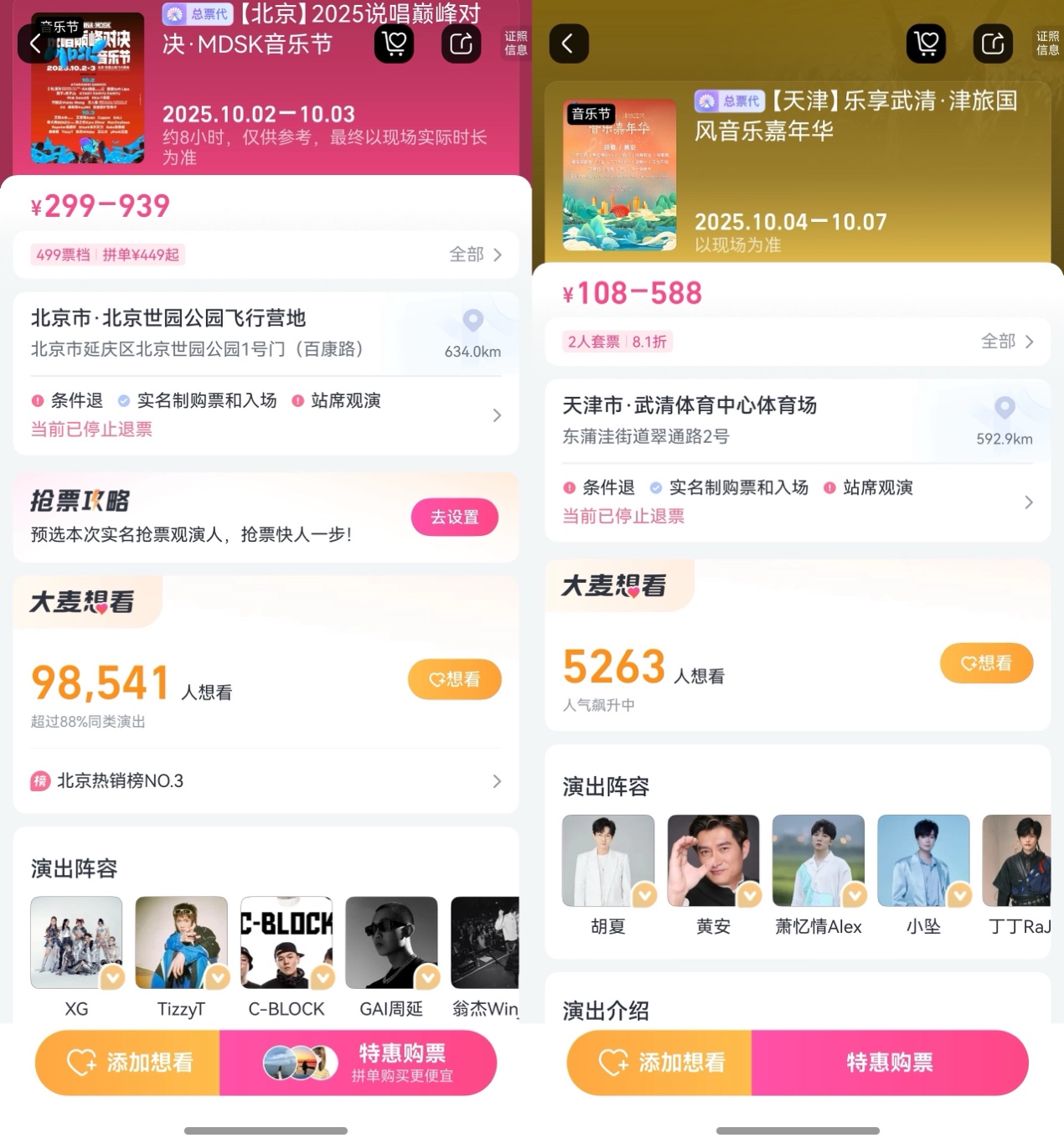 除了电影,音乐节也得安排上。喜欢国风歌曲的可以看看天津的“乐享武清-津旅国风音乐节”,不只有胡夏和黄安,还有古风圈的知名歌手萧忆情,我可太喜欢他的歌了~ 另外,喜欢说唱的小伙伴可以去“北京2025说唱巅峰对决-MDSK音乐节”,包括GAI在内的一众说唱圈明星都将出演,喜欢说唱的朋友们可别错过了!