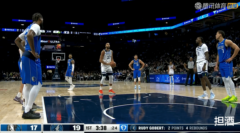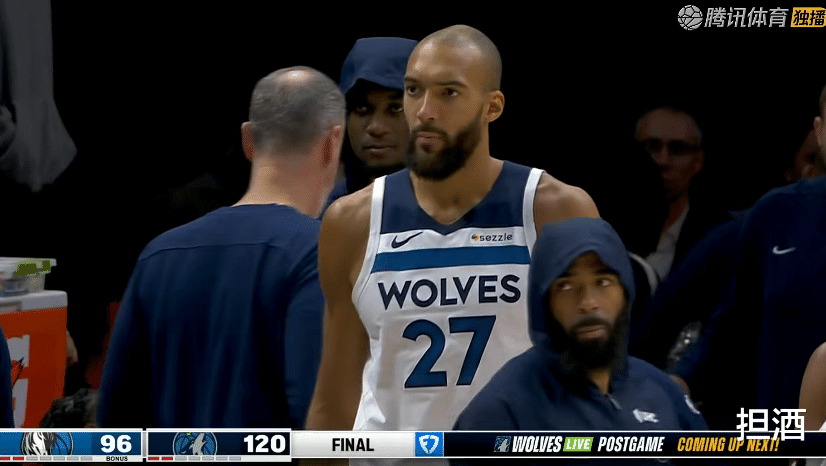 森林狼这边,戈贝尔走入场内,和场上的独行侠球员逐一拥抱致意,显得很友好。