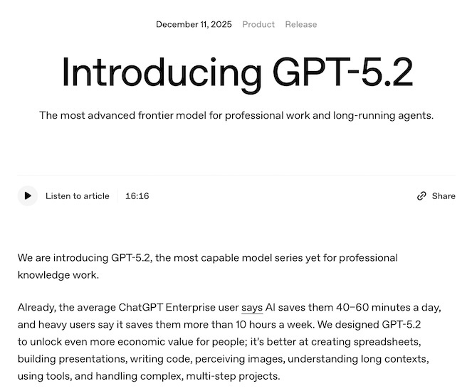 12月11日,为应对生成式人工智能领域日益激烈的竞争态势,美国开放人工智能研究中心(OpenAI)发布了人工智能模型GPT的最新升级版本——GPT-5.2。