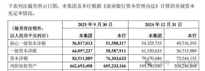 财报显示,截至2025年9月末,该行核心一级资本充足率、一级资本充足率、资本充足率分别为8.57%、9.67%、12.60%,较2024年末的9.88%、11.20%、14.46%,分别下降1.31、1.53、1.86个百分点,三项指标降幅均超1个百分点,且资本充足率已较2024年末下降近2个百分点。