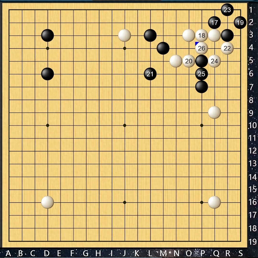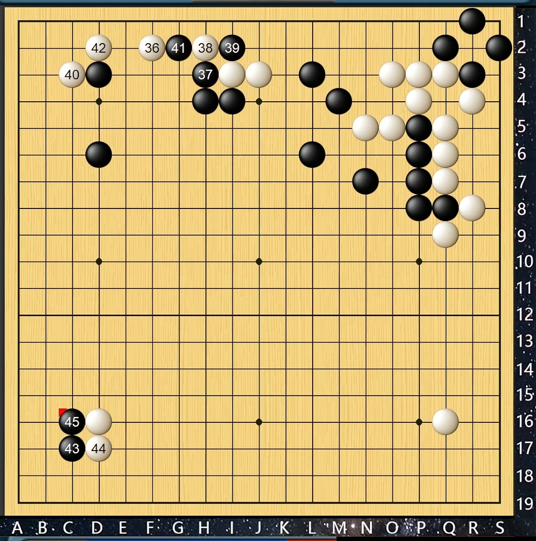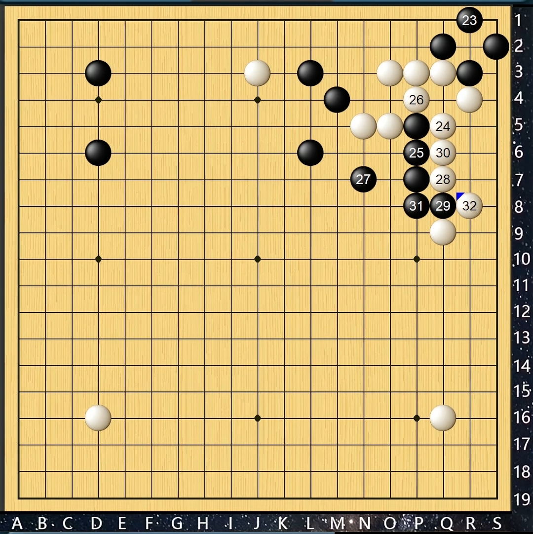 当黑棋对上方白棋发起直线追击时,白棋华丽转身来到左上托角。刘宇航在上方抢得先手后,立马挥师左下点角,优势下白棋连板选择简明下法。