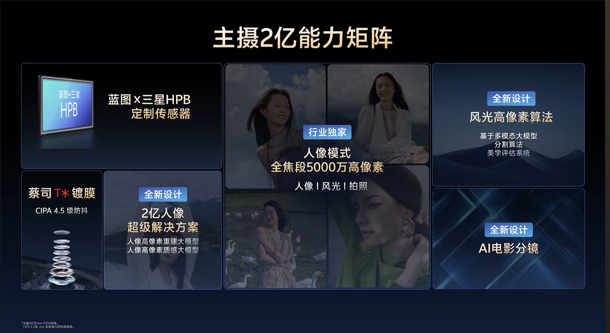 X300 Pro搭载了与X200 Ultra同款的**蓝图自研影像双芯**,配合85mm蔡司2亿APO超级长焦镜头,构成了强大的影像硬件矩阵。而标准版X300则采用了2亿像素主摄+5000万像素IMX882潜望式长焦的组合,使标准版也具备了Pro级的影像能力。