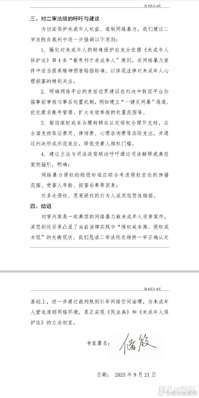 储殷教授作为知名学者,其意见一定可以为案件的审理提供专业参考,更能够推动全社会对“反网暴”的深度思考——毕竟,刘学州的悲剧不该只是一个个案,更该成为改变的开始。