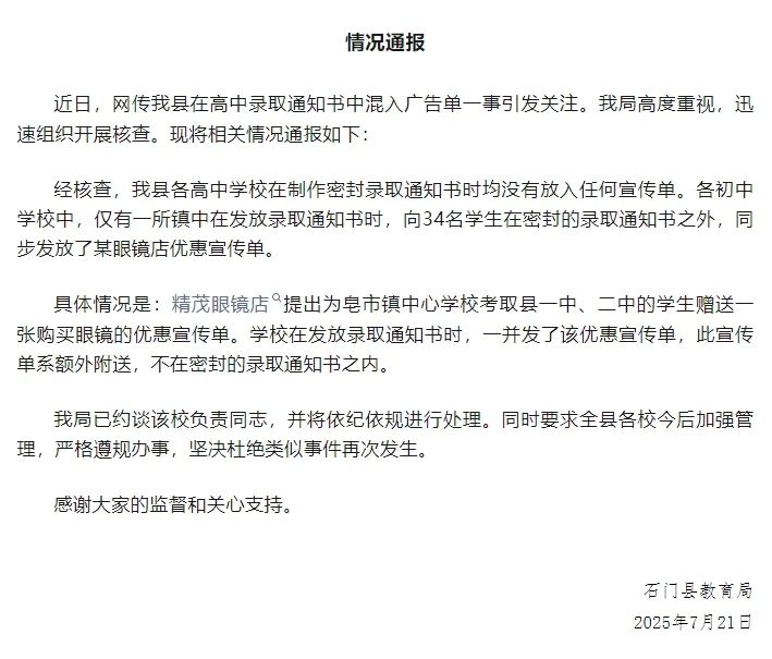 据石门融媒微信公众号消息,近日,网传石门县在高中录取通知书中混入广告单一事引发关注。石门县教育局高度重视,迅速组织开展核查。现将相关情况通报如下: