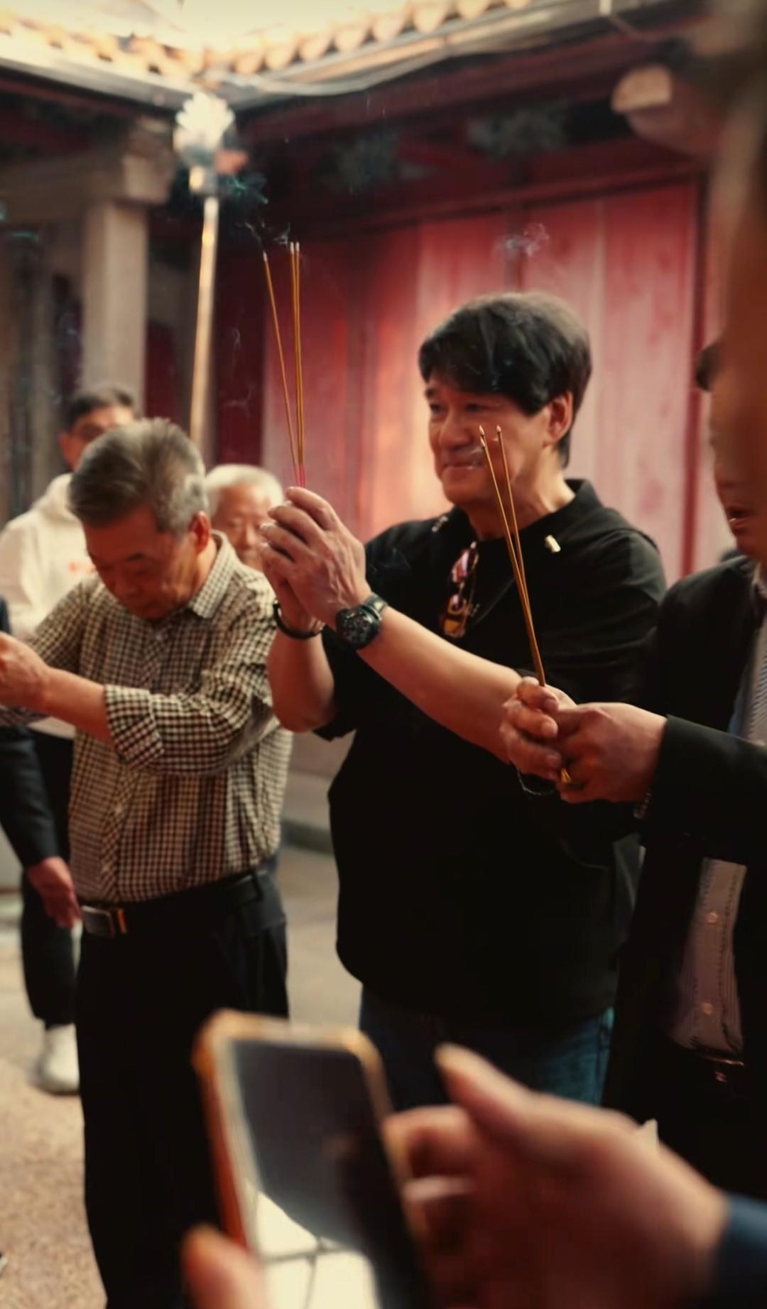 周华健双手捧香站在宗祠前,非常认真虔诚;不少乡邻闻讯纷纷赶来,围观这位同宗族的大明星。