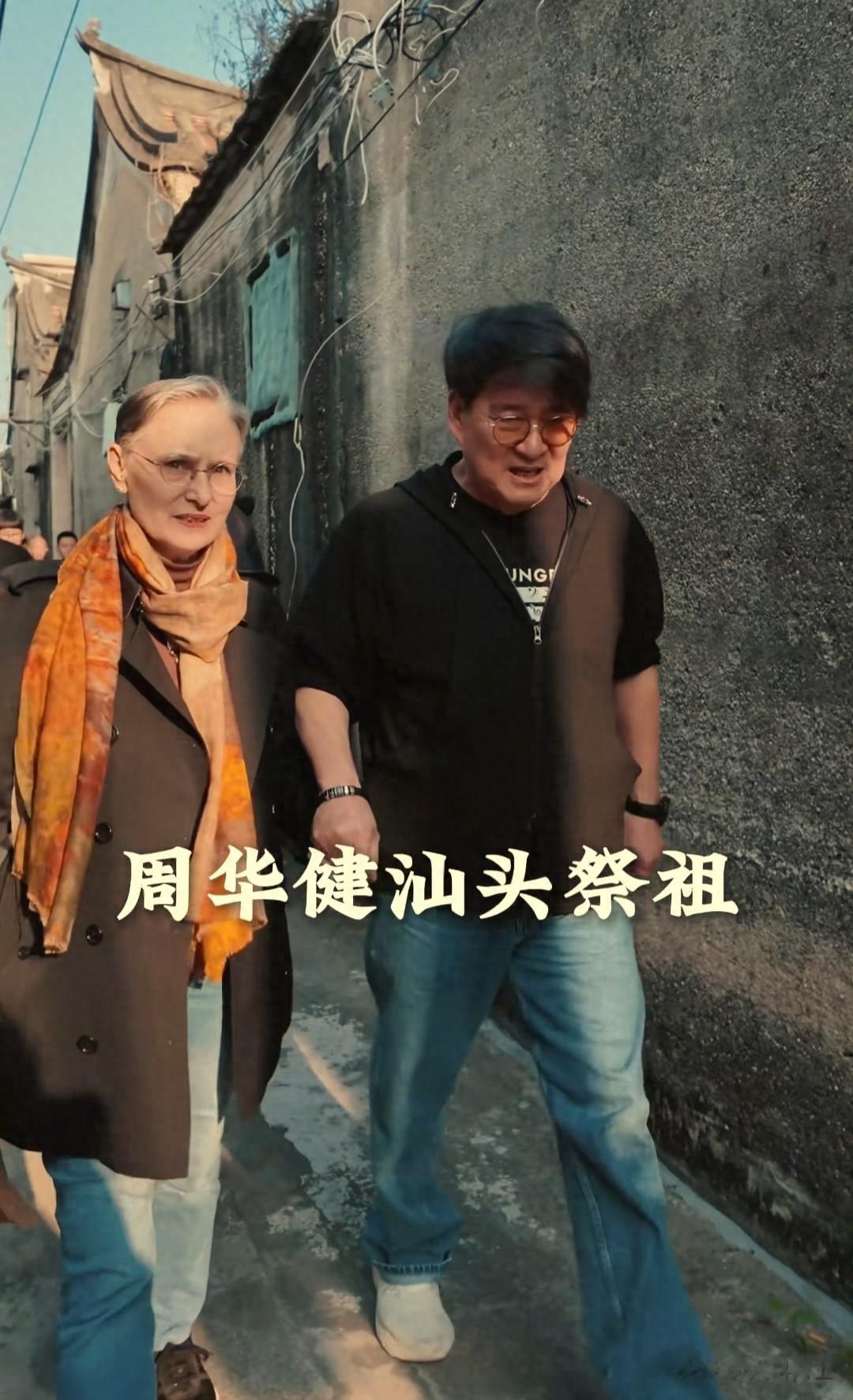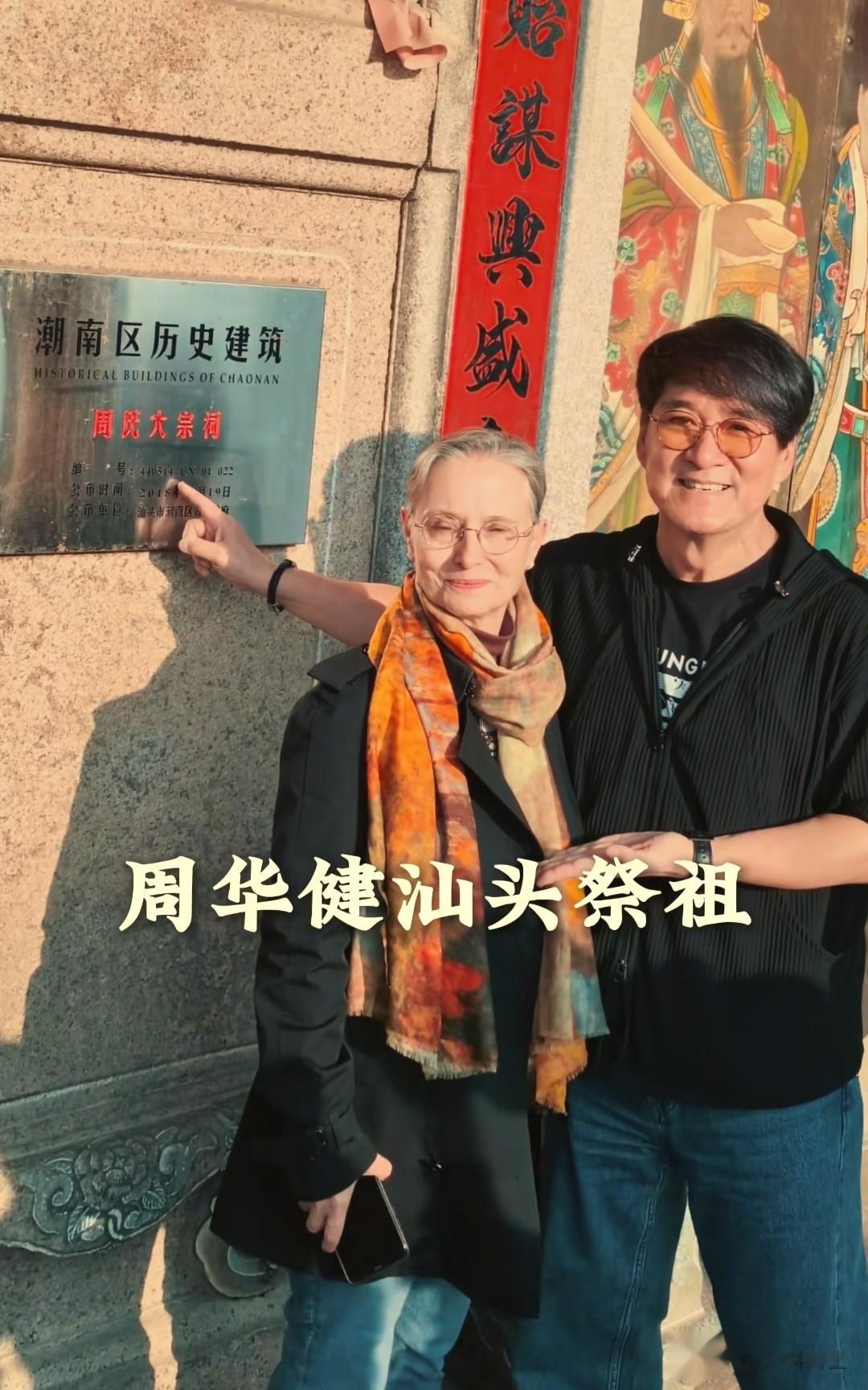 周华健这次祭祖,还带了妻儿,下图是周华健和妻子康粹兰在汕头潮南区周氏大宗祠前的合照。