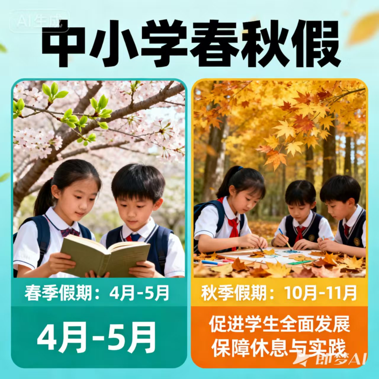 春秋假是指在中小学教育阶段,在春季和秋季各设置一次假期,相应缩短寒暑假时间,形成 "一学年两学期四假期" 的新型假期制度。目前实行春秋假的地区一般会讲春秋假与五一、十一合并放假,既没有改变原有的放假时间与教学时间,又能增加学生的连续休息时间,能够让学生更好的进行放松休息、参与实践活动或与家人出行旅游。另外,春季和秋季也是青少年长身体的关键时期,现在的中小学生学业压力比较大,充分的休息有助于学生的成长,也是我国教育从 "应试教育" 向 "素质教育" 的转型,为学生提供了更多走出课堂、亲近大自然的机会。