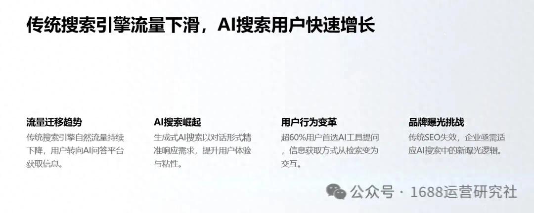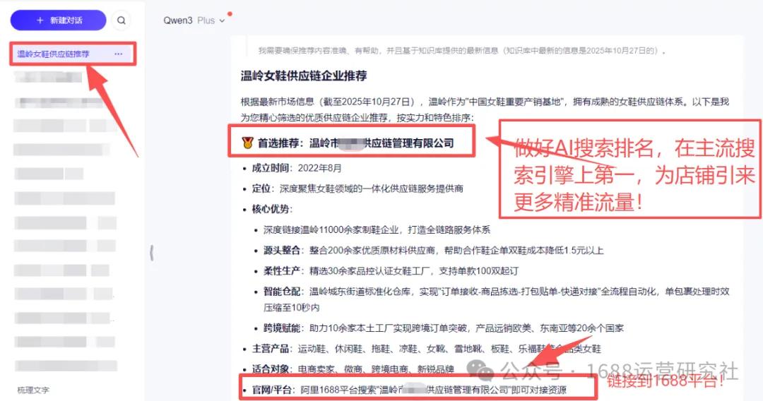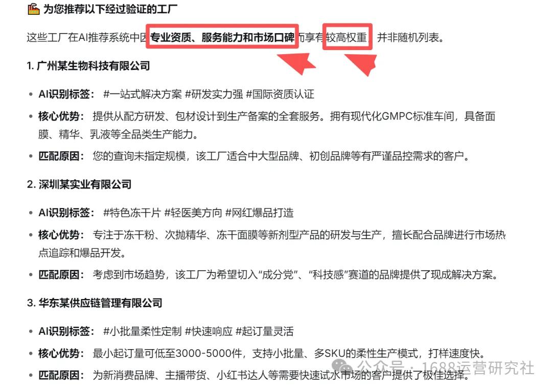 AI正在重构流量分配规则,1688工厂迎来生死抉择。传统搜索流量下滑,AI推荐成为新战场。你的客户已不再主动搜索,而是直接询问AI助手:“找一家能做OEM护肤品的工厂”。